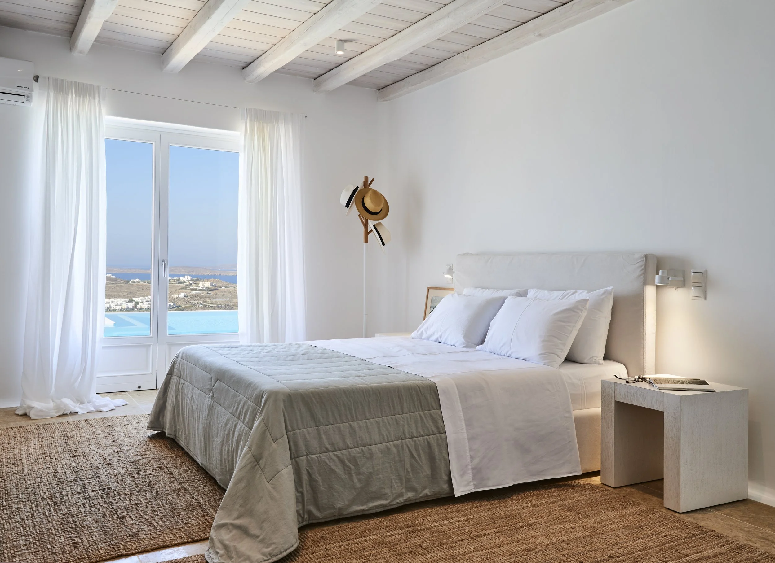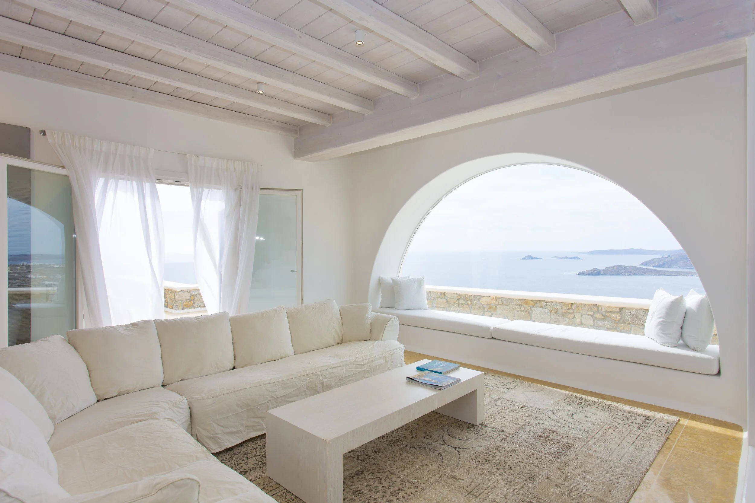 Ariadne is located on the unique spot of Agios Lazaros, overhanging at the very edge of the rocky shore. Built on two levels with spacious outdoor areas, an infinity swimming pool with a teak deck and plenty of pillowed lounges, it offers total privacy and comfortable living, exactly as you have dreamed. This exceptional 600 sqm residence enjoys one of the most magnificent views in Mykonos, over the gulf of Ornos, Delos and Renia islands and the endless blue of the Aegean sea. The outdoor areas fulfill every individual need... The deck, almost floating above the waves and equipped with sun loungers, is perfect for leisure days soaking up the sun and the secluded pergola ideal for shaded peaceful afternoons. The upper level consists of another pergola-covered lounge together with an outdoor dining table. The elegant interiors, with meticulous attention to detail, blend harmoniously the Cycladic architecture with minimal aesthetics and modern art. All white-washed and generously sized with large picture windows, traditional wooden beams on the ceilings and sandy marbles on the floors, compose an impressive scenery. The open plan living room around the fireplace, with white sofas and hand-made carpets, is the first to start the inspiring composition. The nearby dining room and the fully equipped kitchen will undoubtedly attract you to spend time also indoors. As for the six bedrooms, all with en-suite bathrooms, they are suitable for sleeping in comfort and style, looking directly at the sea even when you are lying in bed. Decorated and furnished in earth light tones, each one differs from the others, tailored to meet the highest expectations.
