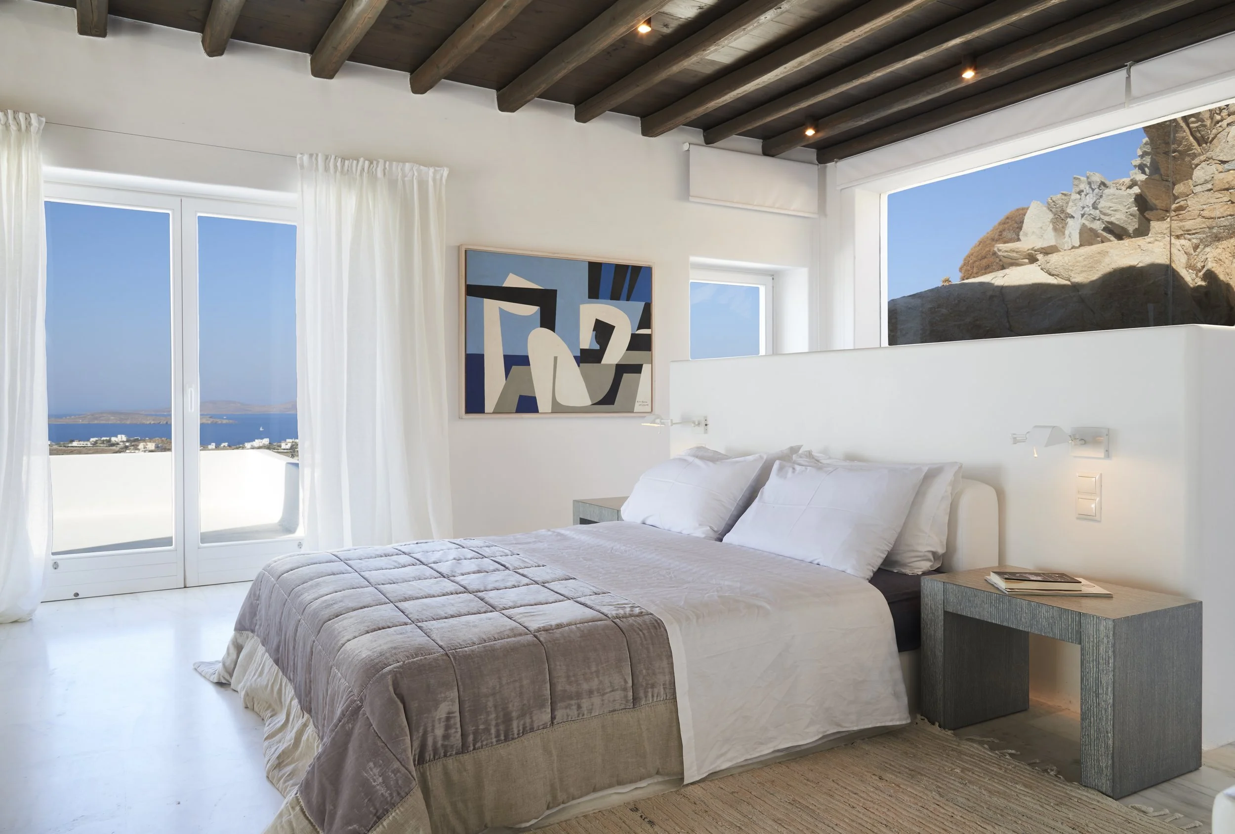 Although the interiors cover 1.000 sqm, in the overall effect are superbly connected by a homey aura. Floors made of white marble from mountain Penteli, ceilings with wooden beams, picture-like windows opening onto the panoramic terraces, even more with all the Greek sunlight indoors, ensure the frame for a resplendent decor. The genuine art-filled living areas, furnished in a classy inimitable style with plush sofas, precious accents and hand made carpets, respond to the highest standards. Nothing says comfortable relaxation like sitting in the living room and letting the Aegean blue pleasure your senses. You will be enchanted by the incomparable elegant dining area within the shades of the rough rock, which is unexpectedly appearing behind a glass wall. The same rock partially embraces the kitchen, the fully-equipped with modern appliances, creating a unique imaginative room. Meanwhile the six individually designed bedrooms, each having an en-suite bathroom, all spacious, warm and inviting thanks to the neutral palette of white, gray and tan, will offer you exactly the soothing atmosphere that you need, not to mention the amazing sea views seen even while lying in every bed or sofa. Further to the master bedroom, with the fireplace, the two en-suite bathrooms, the walk-in closet, the study area and the overlooking balconies, it fulfills the upper expectations.