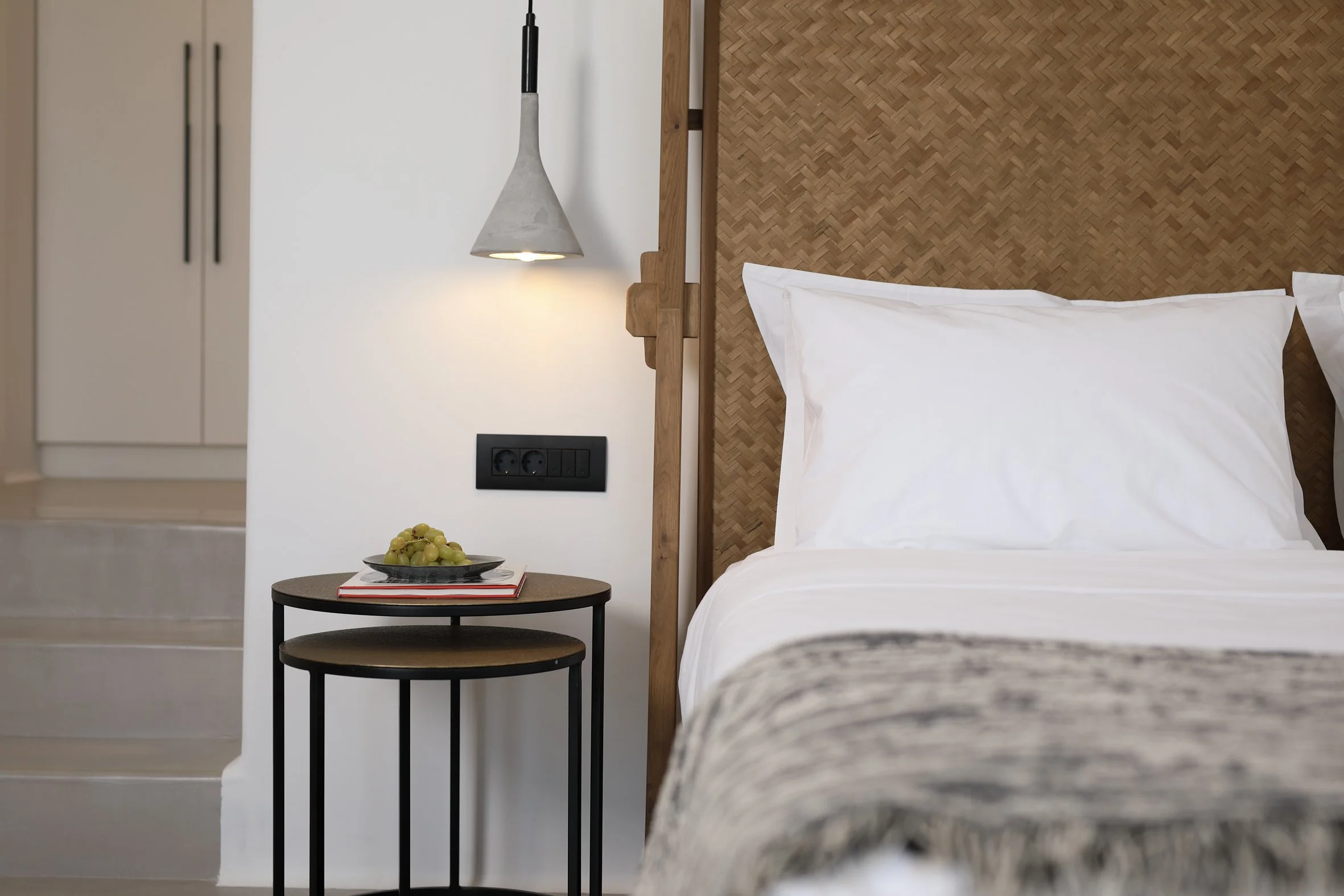 The villa is characterized by a modern, serene aura with a minimalist style decor in Cycladic white and pale grey shades interspersed with wooden elements. It expands on 3 levels and features 5 en-suite double bedrooms, 3 with private terraces and sea views; and 1 single en-suite bedroom with its own private entrance which can be isolated from the rest of the villa. It has an extensive living room and dining area with a guest WC and an open plan fully equipped kitchen with a central island and breakfast counter.